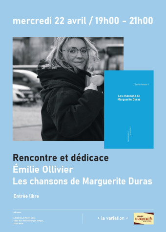 VENDREDI 22 AVRIL, 19h-21H: LANCEMENT LES CHANSONS DE MARGUERITE DURAS, Emilie OLLIVIER, éd. La VariationA l'occasion de la commémoration des trente ans de la mort de Marguerite Duras, de nombreux ouvrages vont paraître pour parler de son oeuvre, de sa vie et redécouvrir s...
