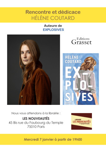 Lire la suiteMERCREDI 7 JANVIER, 19h-21H: LANCEMENT EXPLOSIVES, Hélène COUTARD, éd. GrassetDans les années 90 à Madrid, une femme explose dans un bar. Cet événement reléguait à l'état de faits divers est en réalité un cri de désespoir d'une femme dans son siècle. Inspirant le...