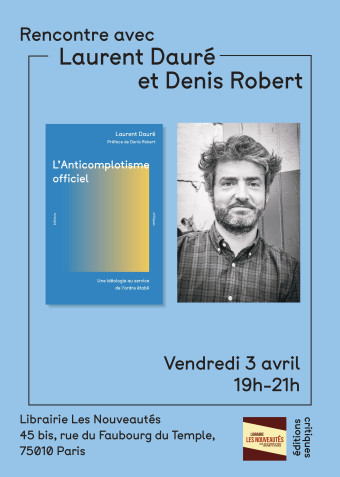 VENDREDI 3 AVRIL, 19h-21H: RENCONTRE L'ANTICOMPLOTISME OFFICIEL: Une idéologie au service de l'ordre établi, Laurent DAURE et Denis ROBERT, éd. CritiquesDans cet ouvrage, l’auteur analyse la manière dont l’anticomplotisme est devenu un discours politique structurant, u...