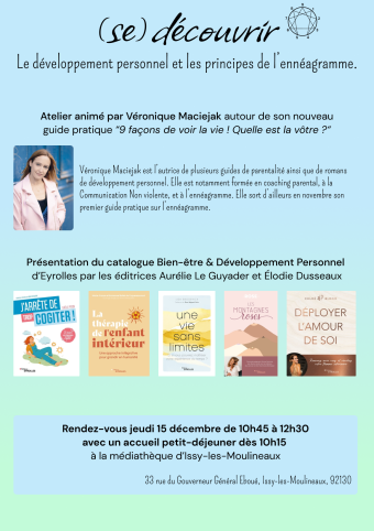 Lire la suiteUne formation sur le catalogue "Bien-être et Développement Personnel" des éditions Eyrolles et d'un atelier thématique animé par l'autrice Véronique Maciejak.
