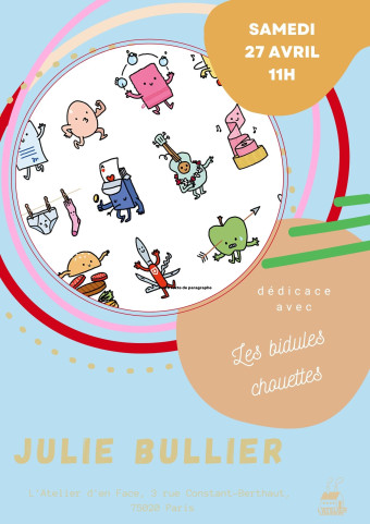 Lire la suiteNous aurons le grand plaisir d'accueillir Julie Bullier et toute la bande des Bidules Chouettes pour une séance de dédicace à l'Atelier jeunesse !Série de petits albums parue chez La Poule qui Pond, les Bidules Chouettes mettent en scène les objets du quotidien dans de fo...