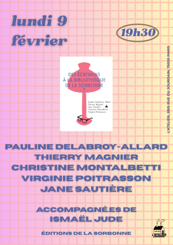 Pour fêter la fin de la collection "Des écrivains à la Sorbonne", nous recevons Pauline Delabroy-Allard, Thierry Magnier, Christine Montalbetti, Virginie Poitrasson, Jane Sautière, et Ismaël Jude pour animer la rencontre.