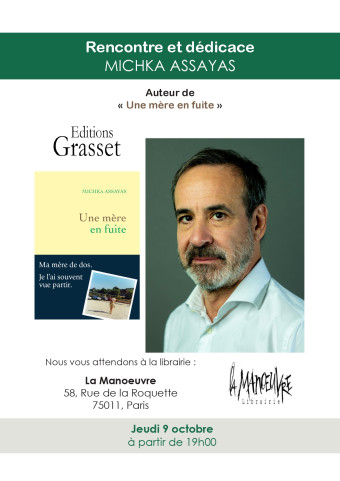 Les éditions Grasset et l'équipe de la librairie La Manoeuvre ont le plaisir de recevoir Michka Assayas pour son dernier titre "Une mère en fuite", le jeudi 9 octobre à partir de 19h00.
