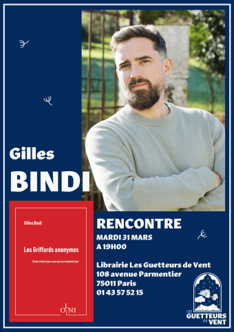 Gilles Bindi sera présent aux Guetteurs de Vent pour le lancement de son premier roman, "Les griffards anonymes", qui paraît aux éditions OLNI.L'occasion d'une très belle soirée aux Guetteurs de Vent (108 avenue Parmentier, 75011) qui débutera avec un échange entre l'au...